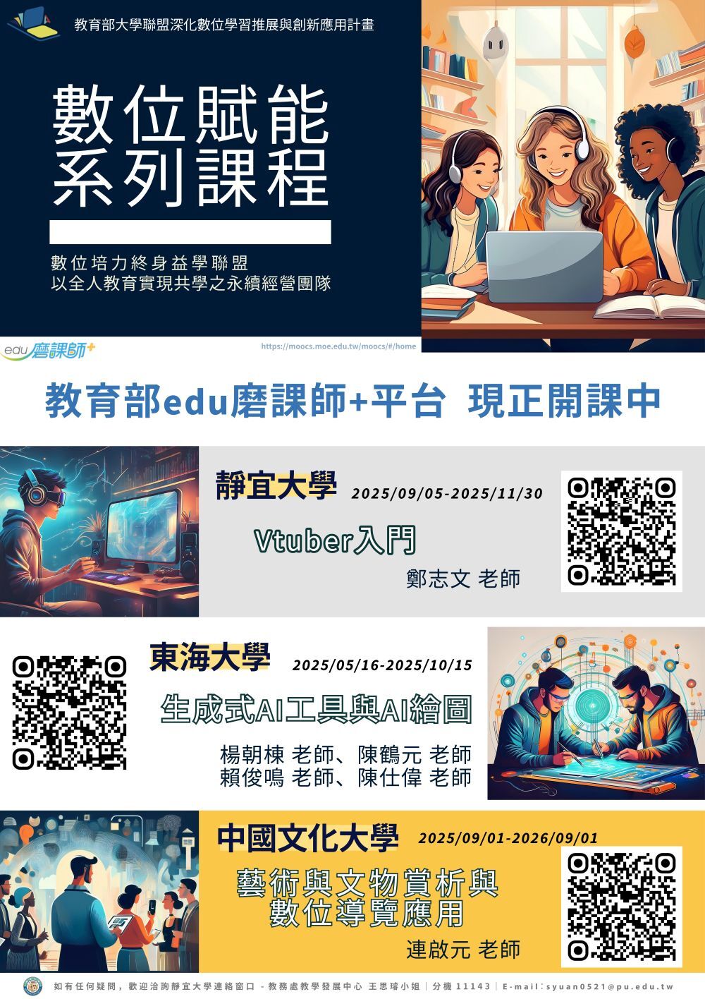 由本校主責的跨校系列課程─數位賦能,此系列課程融合人文和數位科技,推動創新與文化理解,鼓勵學生創新思維,將新技術應用於傳統人文領域,開闢新的研究與表達方式,並增強理論與實踐的結合,提升學生對科技在實際應用中的理解,期望培養學生既懂科技又具備人文素養的跨領域人才。